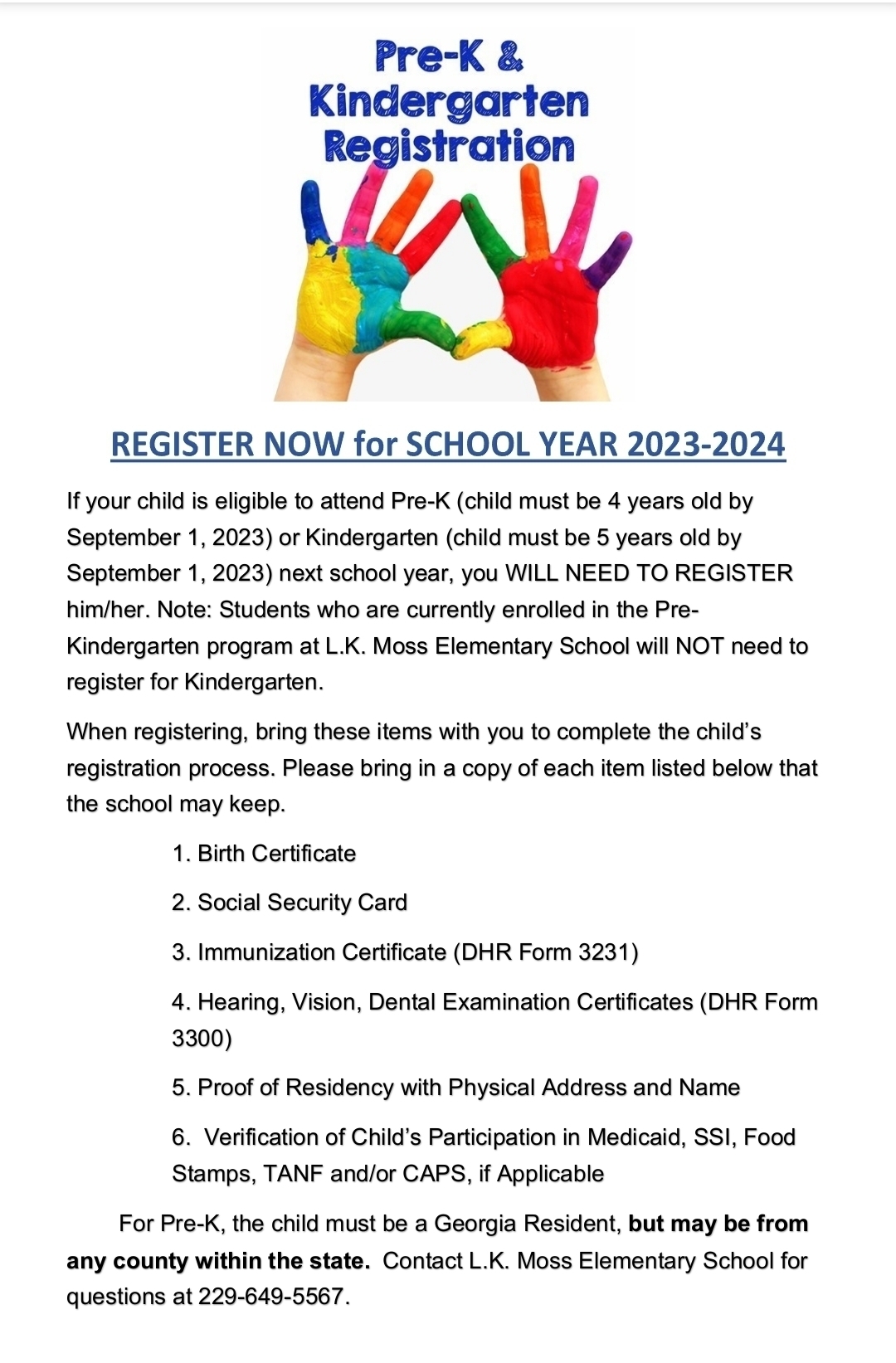 L.K. Moss Registration for Pre-K and Kindergarten is now open.